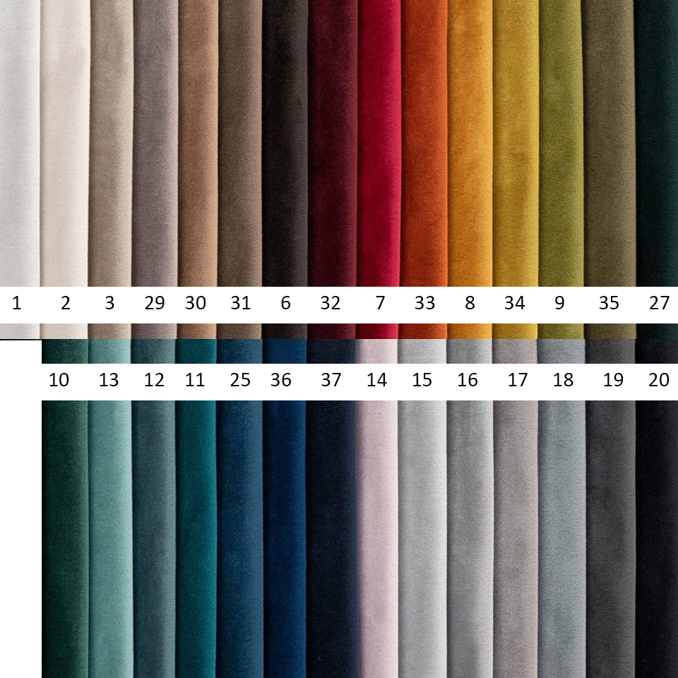 1 – Cream, 2 – Beige, 3 – Mika, 29 – Taupe, 30 – Tobacco, 31 – Teak, 6 – Espresso, 32 – Chaianti, 7 – Dark Red, 33 – Rust, 8 – Mustard, 34 – Amber Green, 9 – Olive, 35 – Cedar, 27 – Jungle Green, 10 – Dark Green, 13 – Mint, 12 – Azur, 11 – Blue, 25 – Navy, 36 – Peacock, 37 – Deep Blue, 14 – Flamingo, 15 – Silver, 16 – Grey, 17 – Elephant, 18 – Anthracite, 19 – Graphite, 20 – Black